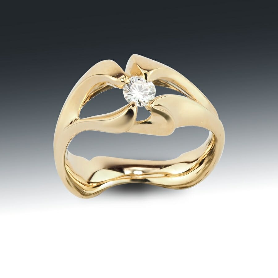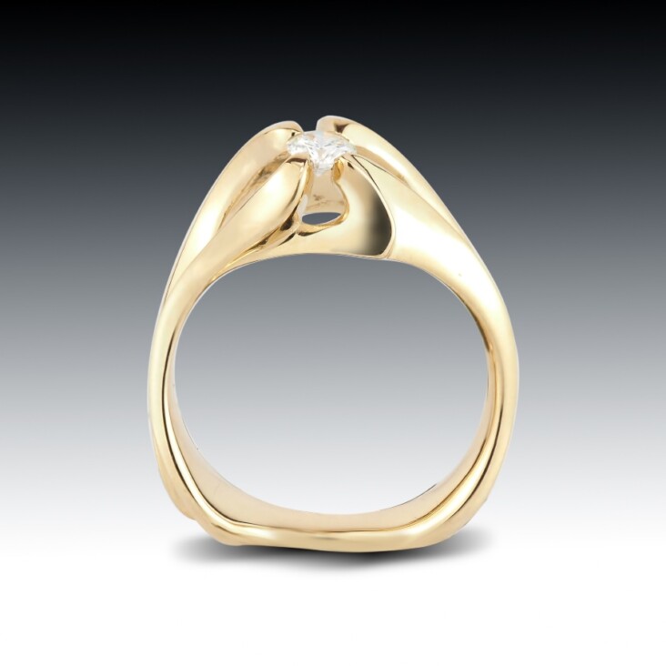 Our petite diamond branchy ring is custom designed and hand crafted. This ring is asymmetrically sculpted in 14k yellow gold and features a solitaire round brilliant cut diamond.