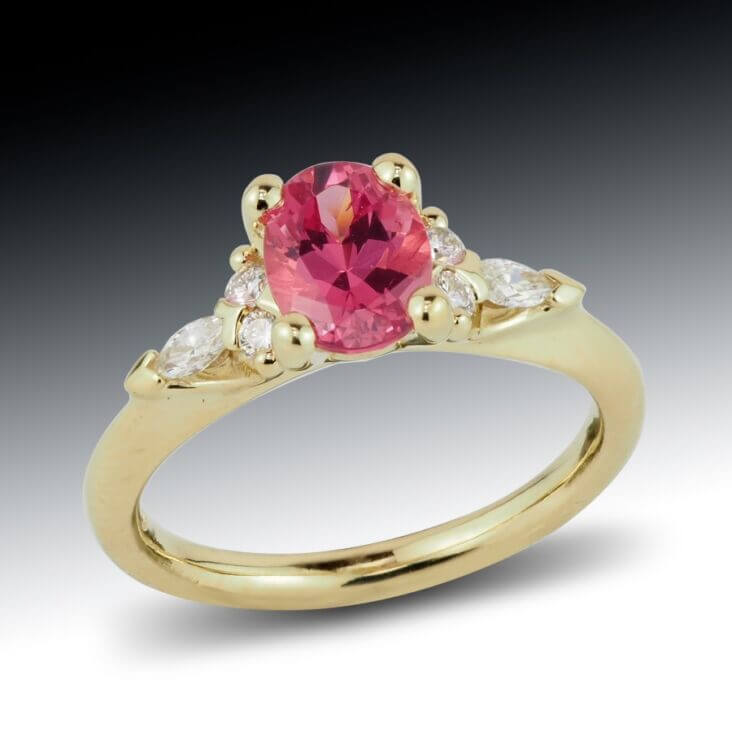 This pink spinel and diamond ring is an exciting addition to our unique collection of fine jewelry. This exquisite custom ring showcases a stunning oval-cut pink spinel as its centerpiece, cradled in a secure four-prong setting. The vivid pink hue of the spinel radiates with brilliance and elegance, making it the focal point of the design. Flanking the center stone are marquise and round brilliant-cut diamonds, artfully arranged to enhance the sparkle and add a touch of sophistication.