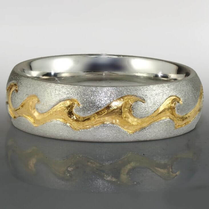 Crafted for the man who appreciates both strength and artistry, this exceptional ring combines timeless luxury with a bold, ocean-inspired design. Made from pure platinum, the band exudes durability and a sophisticated luster. Flowing along its surface is a hand-inlaid 24K gold wave pattern, symbolizing power, motion, and the enduring rhythm of nature.