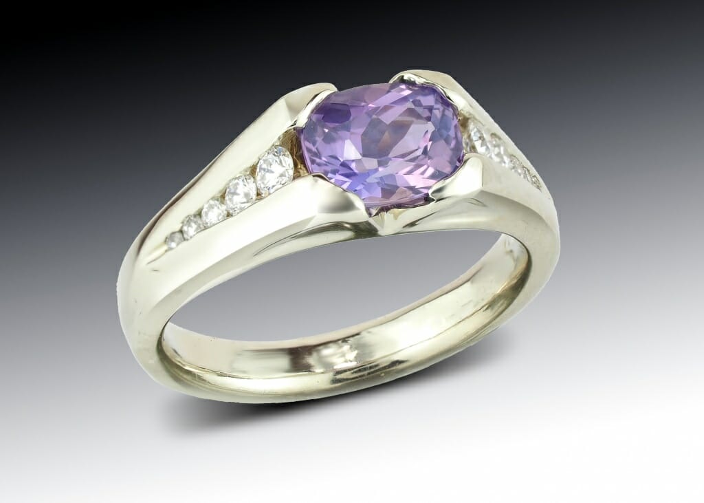 Our purple sapphire and diamond split shank ring is custom designed and crafted at our studio in Boston. This oval purple sapphire is set in a white gold split shank ring with a tapered channel of diamonds on either side.