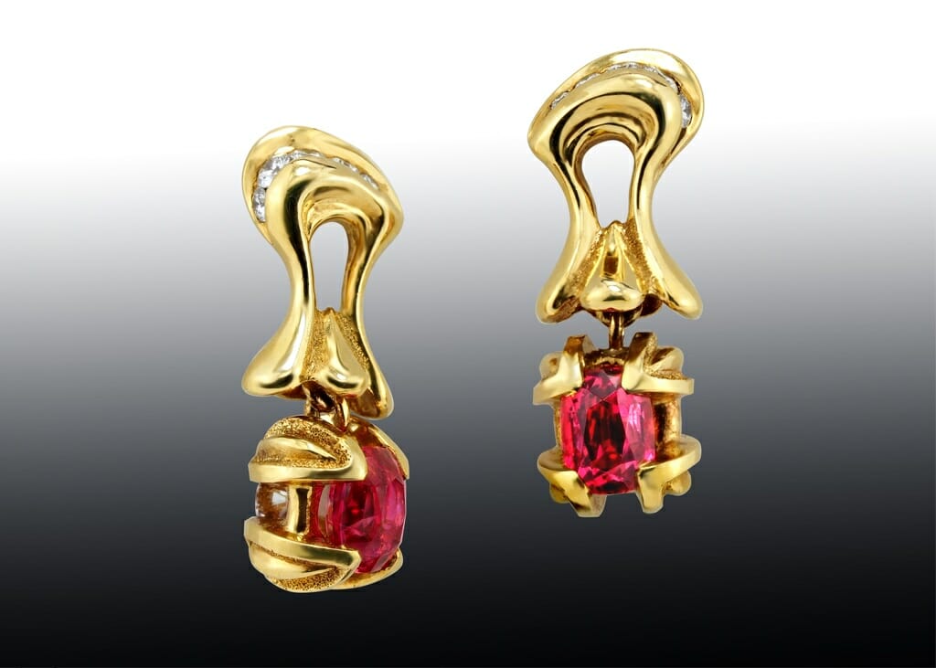 Spencer custom designed these one of a kind earrings with his usual attention to detail. They feature hot pink/ red spinel gemstones set in rich 18k yellow gold with tiny diamonds wrapping around the top edge. But they also have a hidden surprise… On the back of the earrings opposite the red spinel is a diamond that can be seen from the back while wearing!