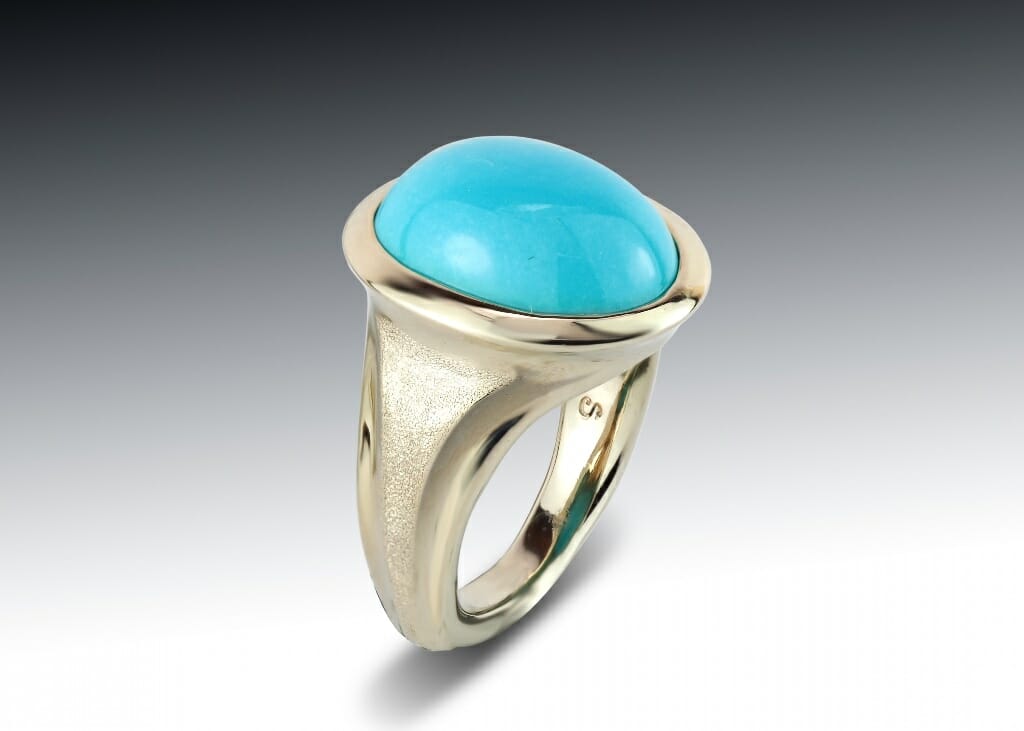 Our sleeping beauty turquoise bezel ring is a custom designed and handmade ring from our shop in Boston. This ring is hand crafted in 14k white gold with a large bright blue sleeping beauty turquoise cabochon. Contact us for help with ring sizing.
