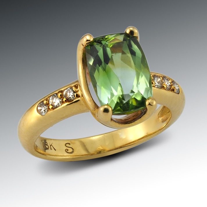 We made this custom designed ring in rich 18k yellow gold to emphasize the bright, fresh green color of this faceted tourmaline. Then we used small diamonds to accent the rounded ring shank, and left the back and sides of the stone open so light can pass through.