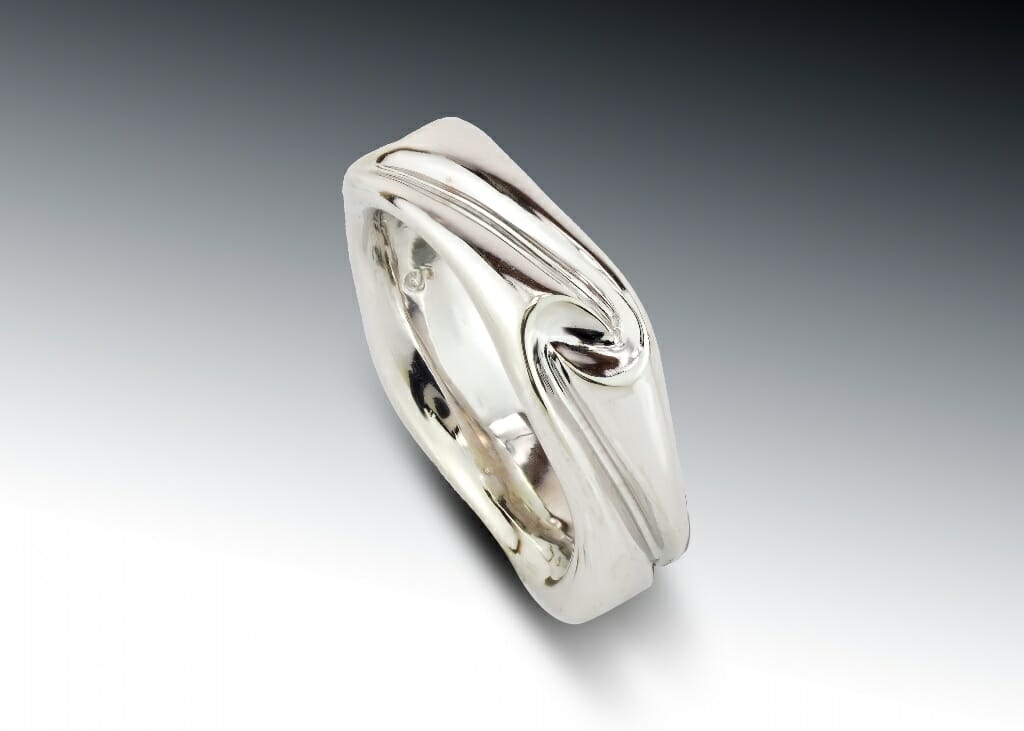 Our square carved swirl band is custom designed and handcrafted, from our studio in Boston. This ring is cast in 14k white gold and rhodium plated. This softly squared ring has a carved swirl design and a rounded comfort fit inside. Contact us for help with ring sizing.