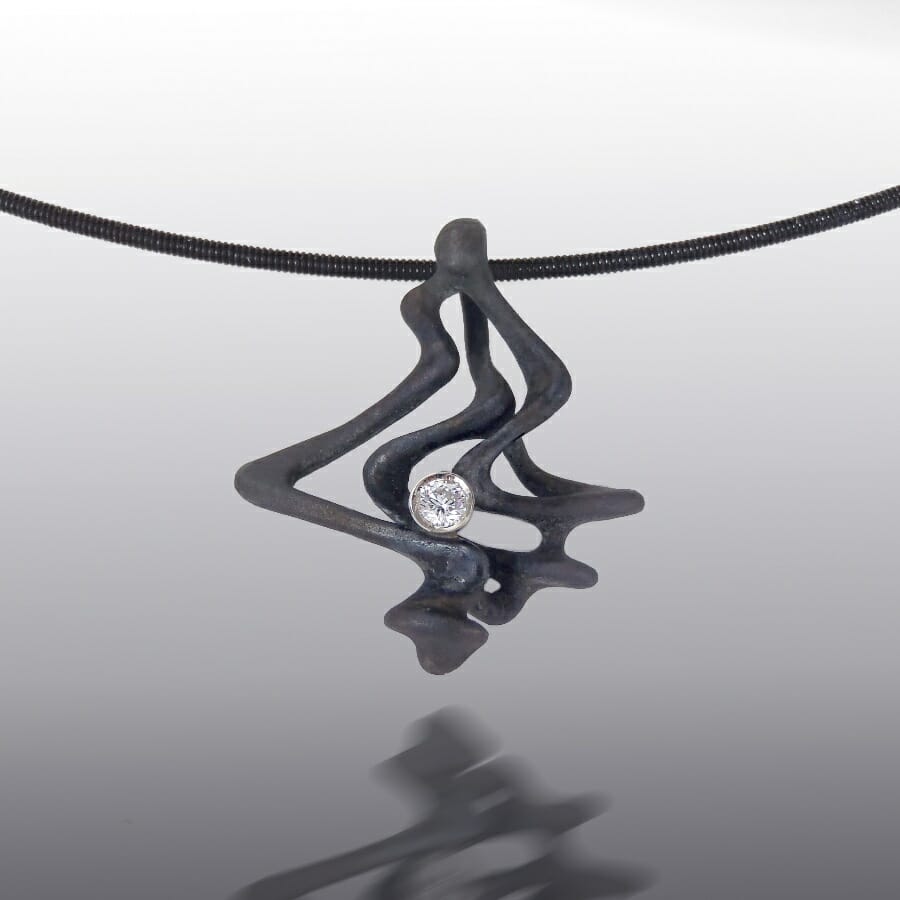 This steel and diamond wavy pendant is a custom designed and handmade piece from our shop in Boston. This pendant is carved by hand and cast in medical grade stainless steel. It is textured and blackened to create a dramatic contrast with the single round diamond set in a white gold bezel. This pendant can be worn on a variety of chains and cords, sold separately.