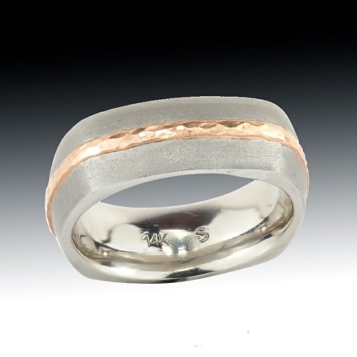Our steel and rose gold square band is custom designed and hand crafted, from our studio in Boston. This ring is cast in medical grade stainless steel and inlaid with a raised ridge of rose gold. The ring is softly squared outside with a rounded comfort fit inside. Contact us for help with ring sizing.