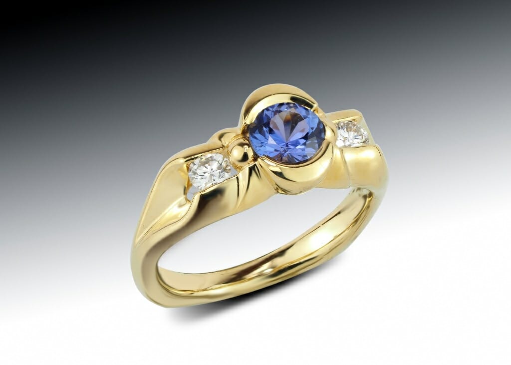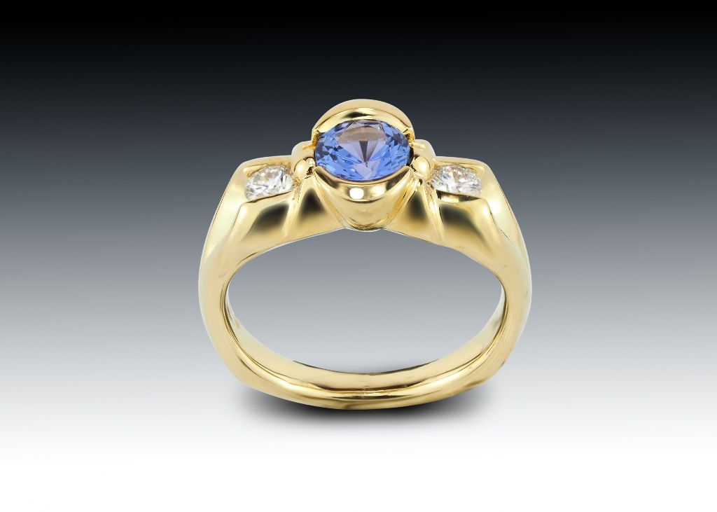This tanzanite and diamond sculpted ring is a custom designed and handcrafted piece from our shop in Boston. This ring setting in hand carved and cast in 18k yellow gold. It is set with a vibrant, intense blue tanzanite and side diamonds. Contact us for help with ring sizing.
