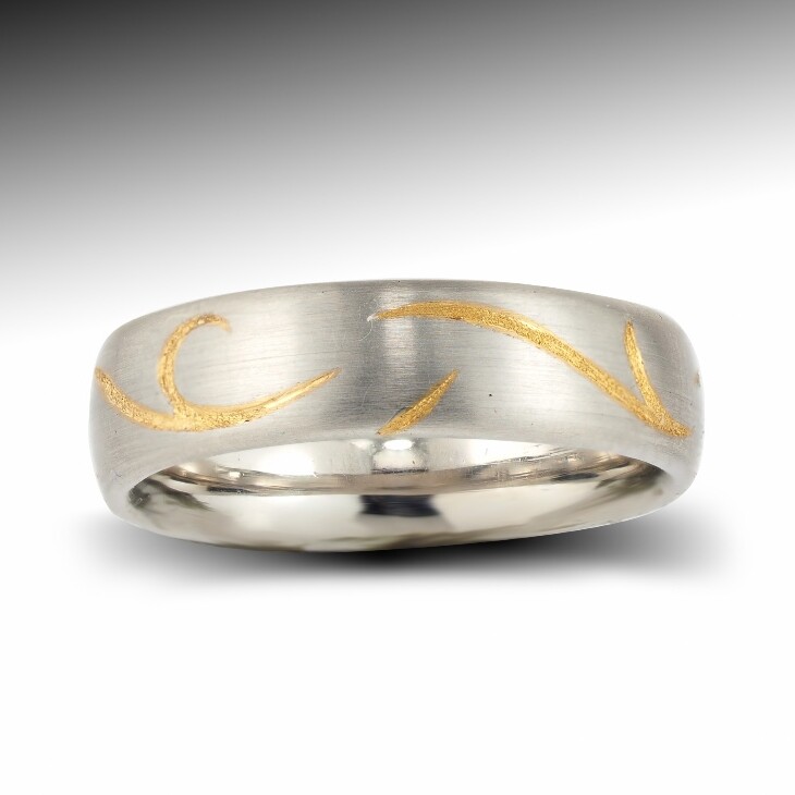 Our wide palladium gold inlay band is hand crafted at our studio in Boston. This ring is made in palladium with a carved design and 22k gold inlay. Our jewelry is designed and crafted one piece at a time. Contact us with questions about ring sizing.